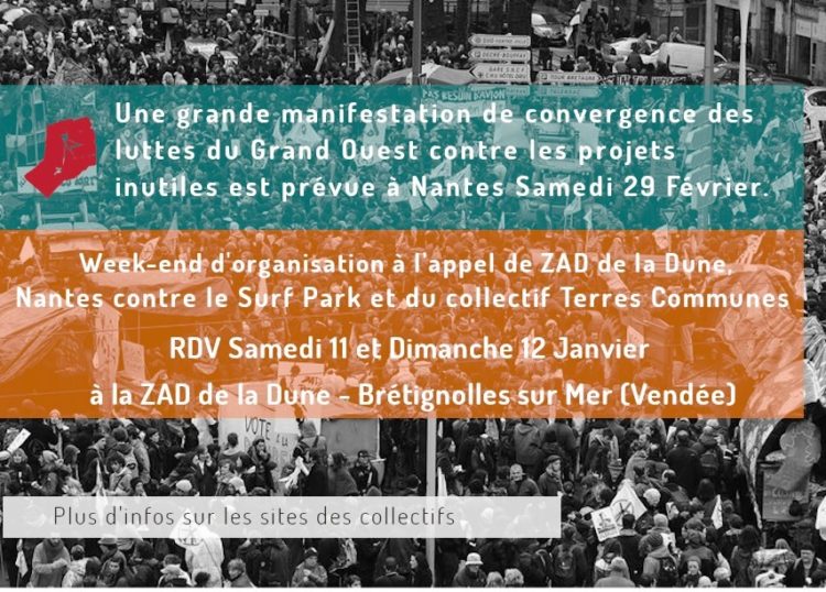 Affiche, appels et infos pratiques pour la manif de convergence des luttes contre les projets inutiles du Samedi 29/02 à Nantes