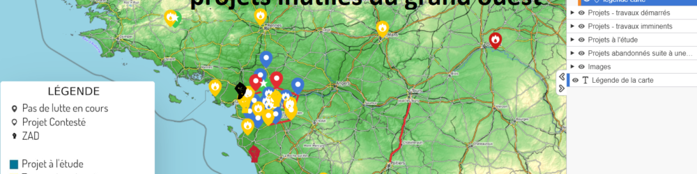 MAJ du 21/12/19 : Grande manif de convergences des luttes contre les projets inutiles du Grand Ouest prévue le samedi 29 Février à Nantes, notez d’ors et déjà la date ! Plus d’infos bientôt. https://www.facebook.com/events/746183769215754/ Et si vous souhaitez participer à l’orga contactez-nous à terrescommunesretz@gmail.com, on est jamais assez nombreux-se-s 😉 Les marches pour le climat en ville, les manifestations anti-capitalistes en ville, c’est … Lire la suite de Carte des petits et grands projets inutiles dans le grand Ouest – Pour mieux y résister et converger nos luttes !