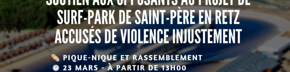 Surf Park de Saint Père en Retz : Le 23 mars 2021 à Saint-Nazaire aura lieu le procès des victimes d’une expulsion illégale et violente par une milice, pilotée par des élus locaux et la FNSEA 44 et couverte par la gendarmerie. Vous avez bien lu, les victimes seront sur le banc des accusé·es. Voici le … Lire la suite de #SurfPark : Rassemblement en soutien aux camarades inculpés le 23 Mars, victimes d’une milice totalement exemptée de charge